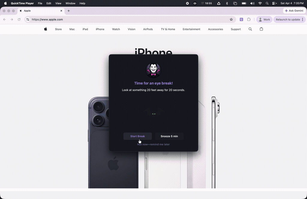 This is a free macOS menu bar app that helps enforce this rule for you. Because let's be honest โ you're probably not going to remember every 20 minutes to do this. And what better way than to use the thing you're staring at all day to help you remember?